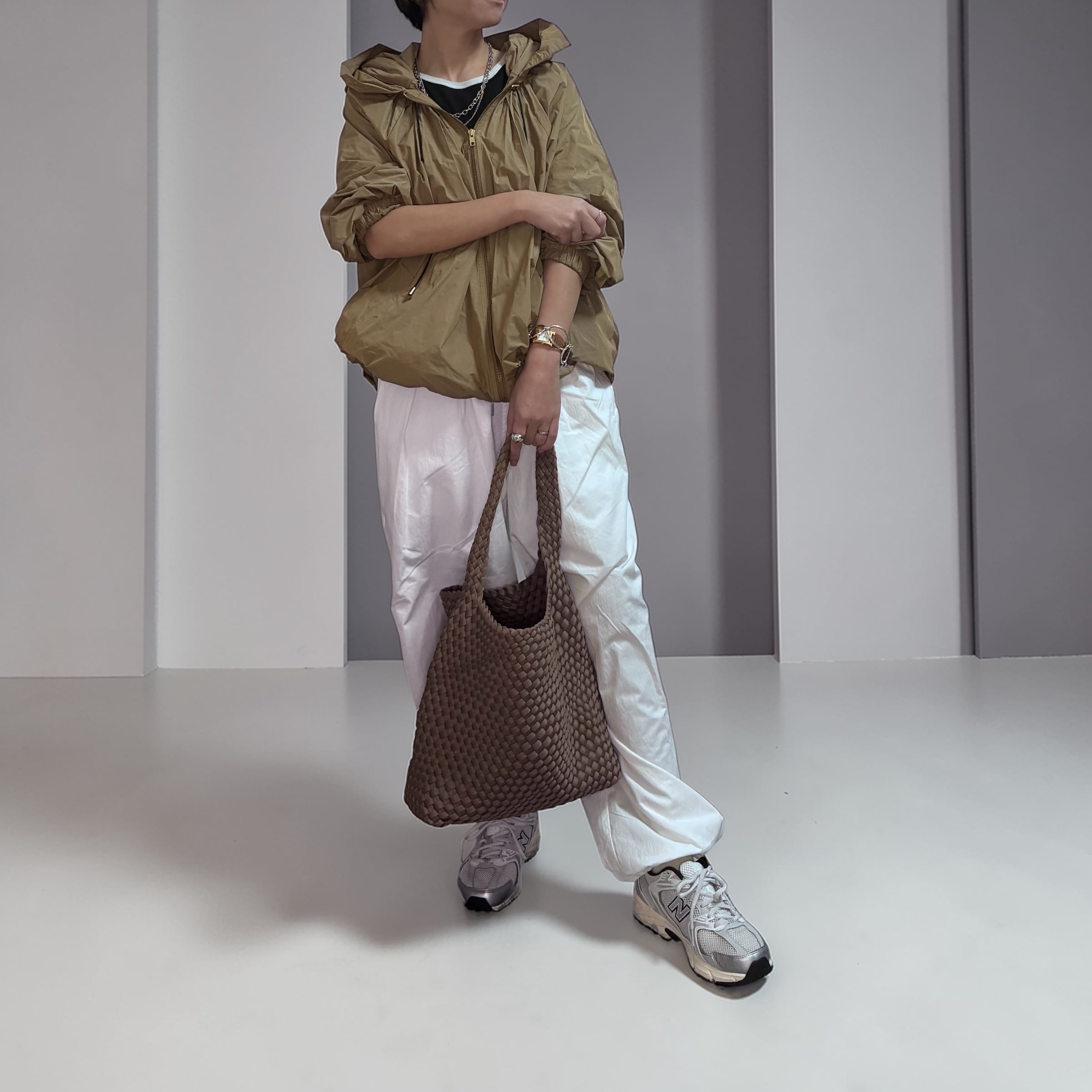 シンプルなワンピースやセットアップに合わせれば、
